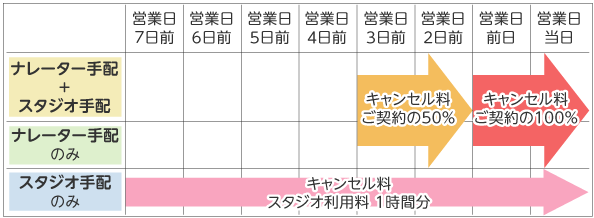 また、キャンセル料金は録音日から弊社営業日3日前より、日時変更の場合でも発生いたします。
